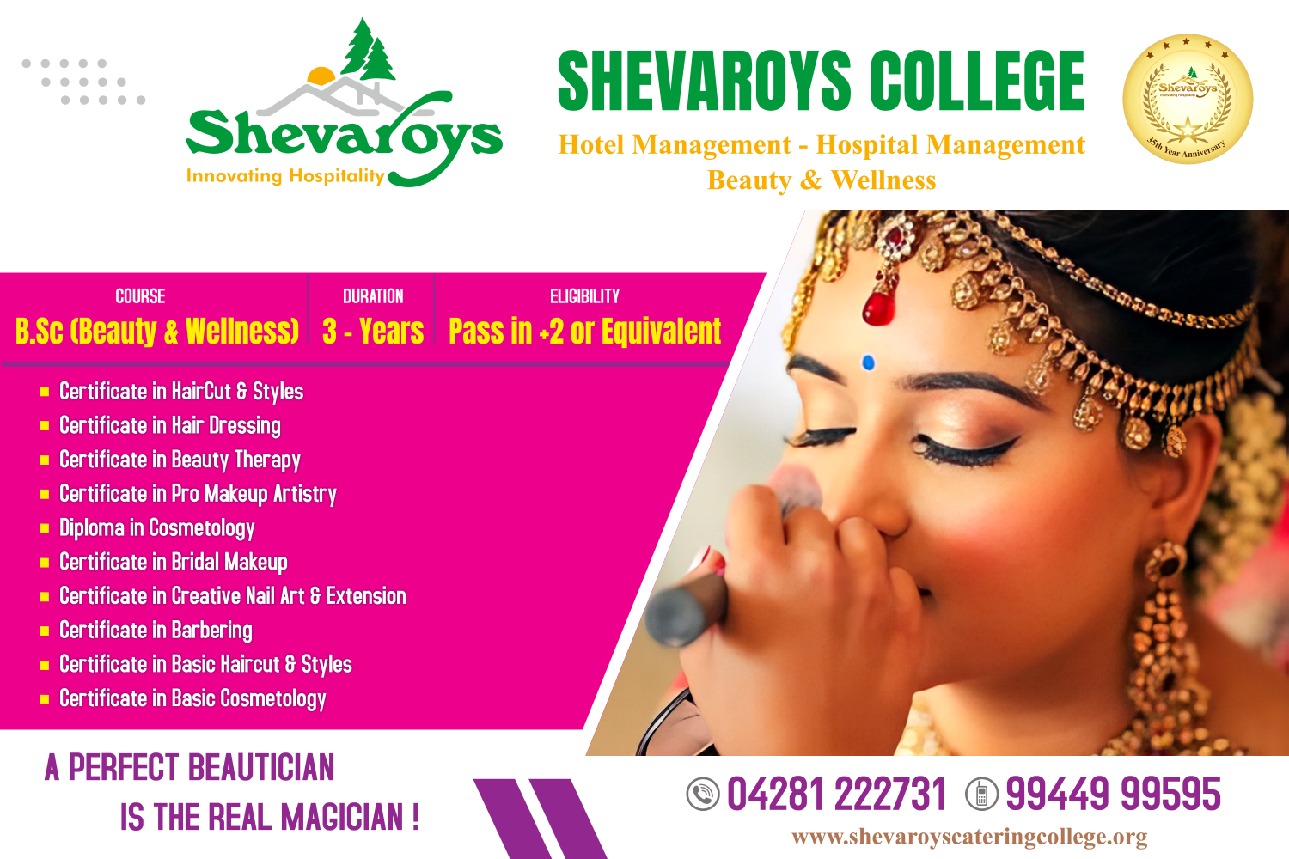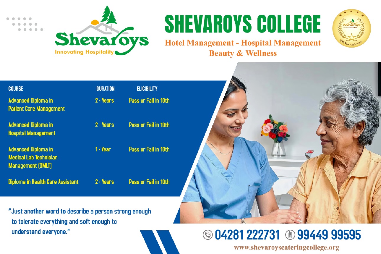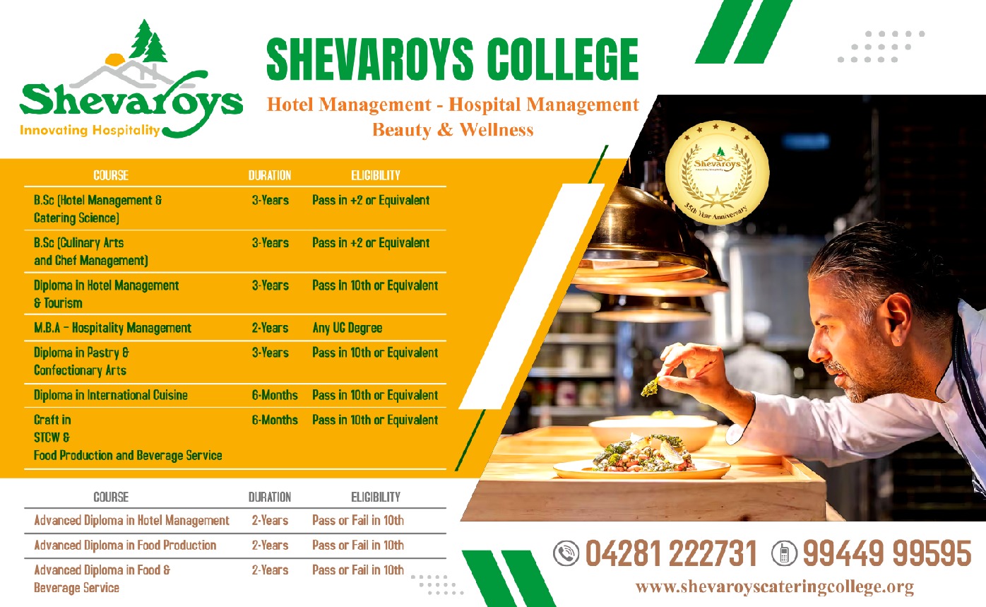 Job opportunities for the successful students of the Shevaroys College of Hotel Management and Catering Technology is plentiful in hotels (Chain and Single), Restaurants, Clubs, Food Service for Airlines, Hospitals the Armed Forces, Institutional Catering, Consultancy Firms, Ships Catering etc. there are also relevant roles throughout the public sectors such as Universities, Local Authorities, Research & Development centers etc. some of the large chain hotels or restaurants offer graduate-management programs for talented employees, providing a fast-track to management positions and experience in a range of operations.